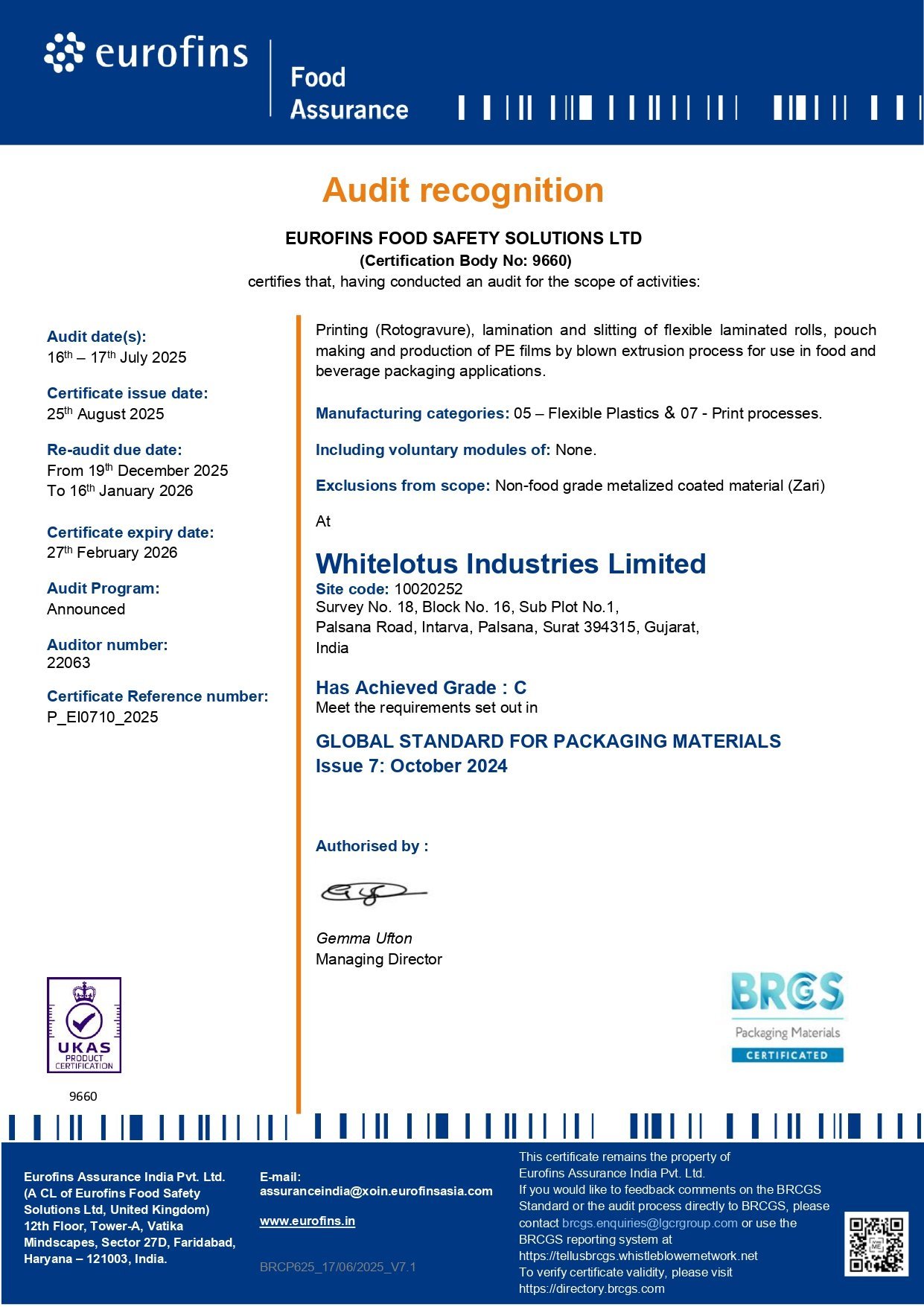 At Whitelotus Industries Limited, we are proud to be certified under the BRCGS Global Standard for Packaging Materials – This recognition, awarded by Eurofins Food Safety Solutions Ltd, demonstrates our dedication to maintaining the highest standards of quality, safety, and compliance in packaging manufacturing.